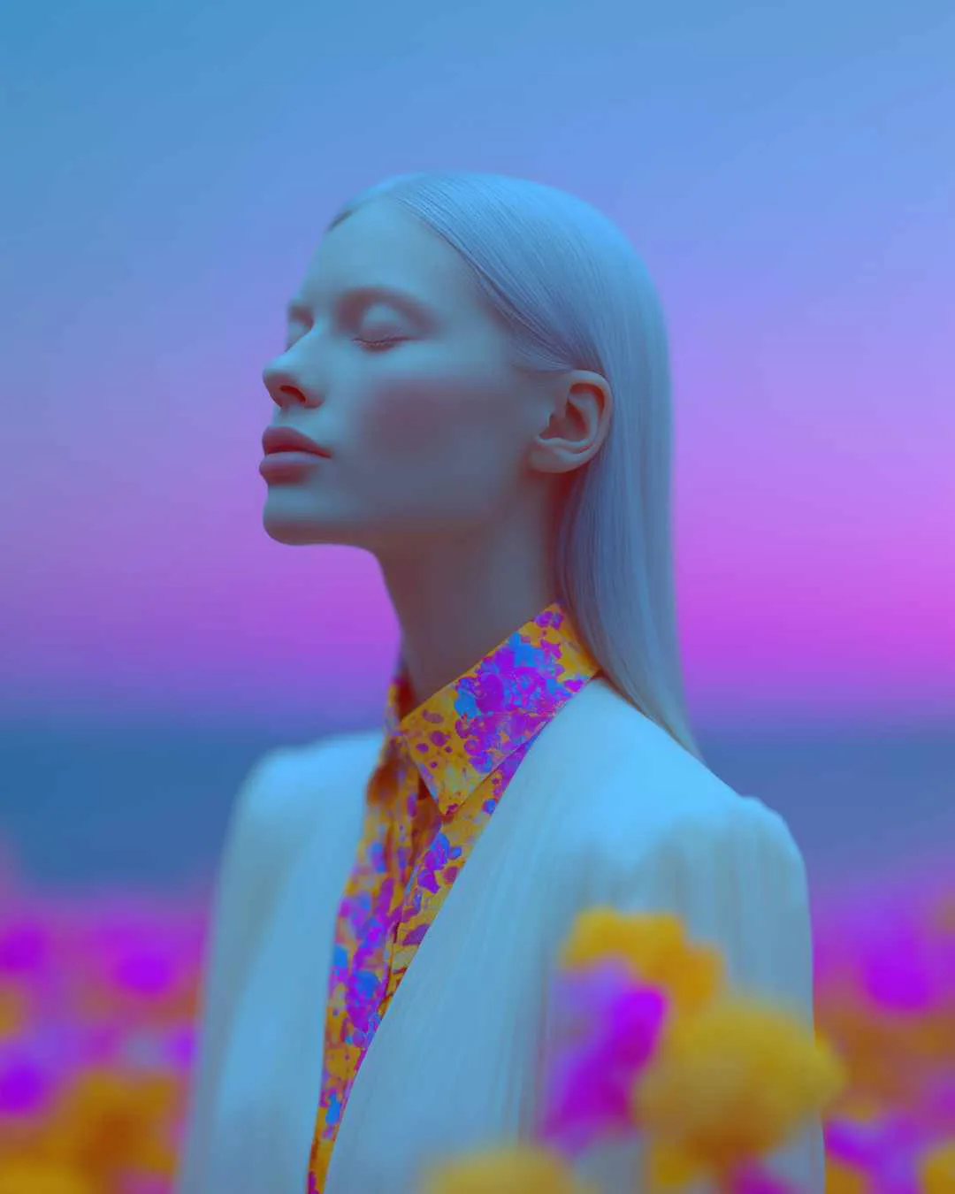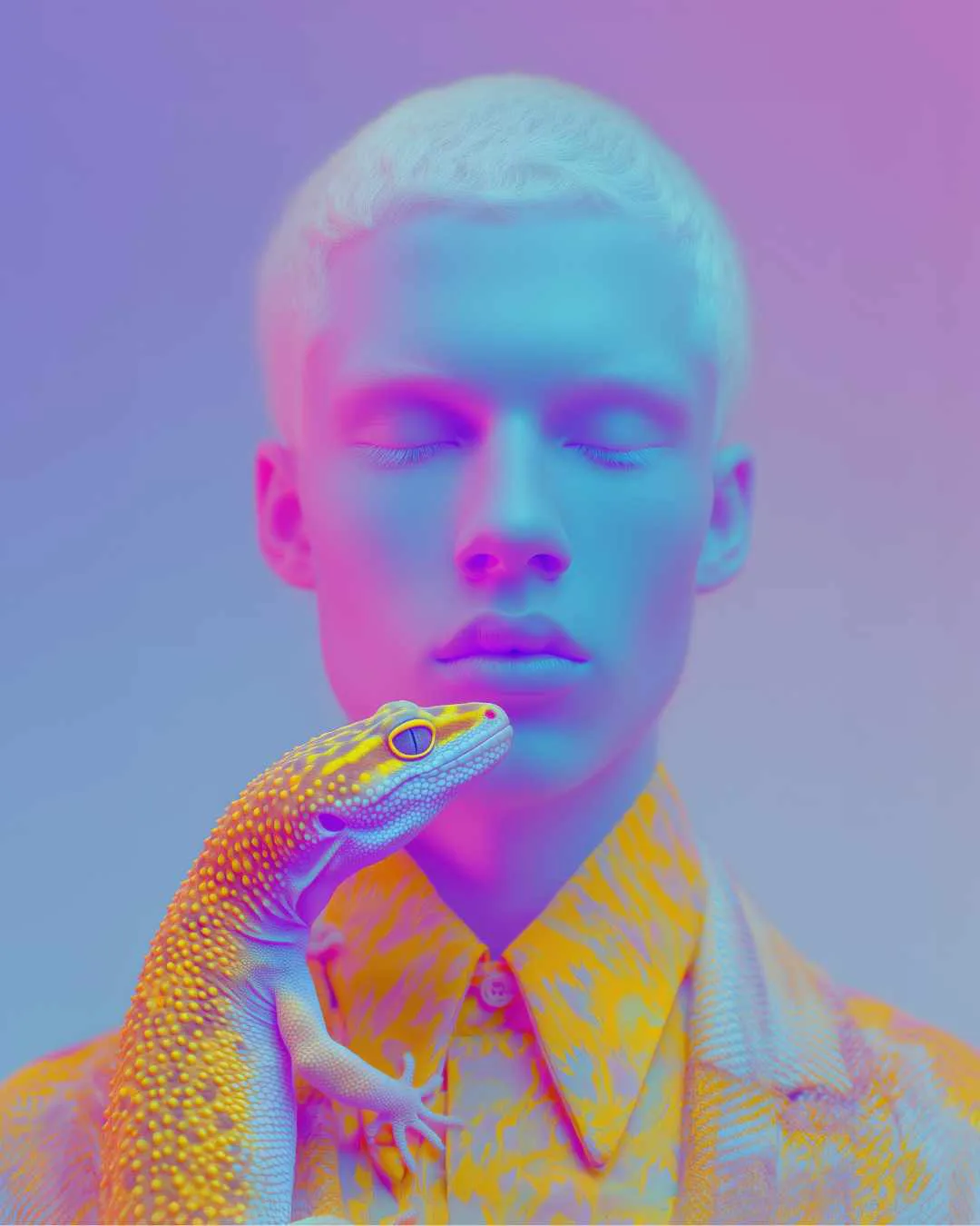 In a digital realm bathed in color and quiet kinship, Désirée Arzić (@desiree.daydreams), based in Wörgl, Austria, composes portraits that dissolve the threshold between waking and vision. Neon Reverie unfolds as a series of figures drifting in radiant fields, their eyes closed as if listening inward, companions emerging from light like emissaries of spirit. A butterfly alights on a shoulder, a gecko shimmers in neon hues, a tiger dissolves into twilight beside its dreamer. The work blurs intimacy with spectacle, treating color as atmosphere, gesture as language, and technology as accomplice in building cinematic reveries that feel deeply human. Each portrait is both luminous and fragile, held in the balance between solitude and kinship.
