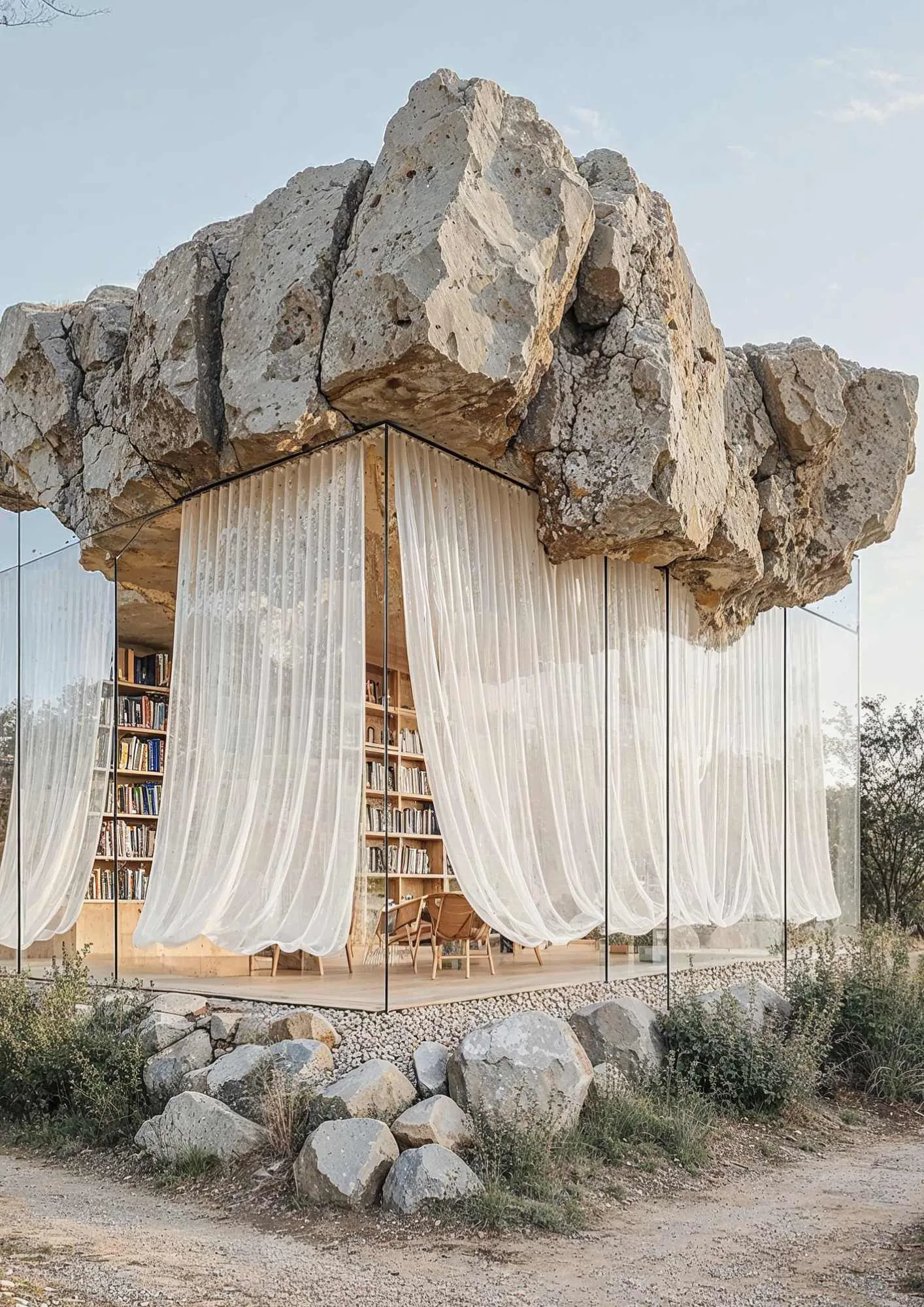 In “Where Stone Remembers,” Banon envisions a monumental hollow carved from rock, transformed into a cathedral of reflection. Workers appear miniature at its base, absorbed by the vast amber glow radiating from within. The structure emanates reverence without ornament, proving that absence can illuminate more than adornment.